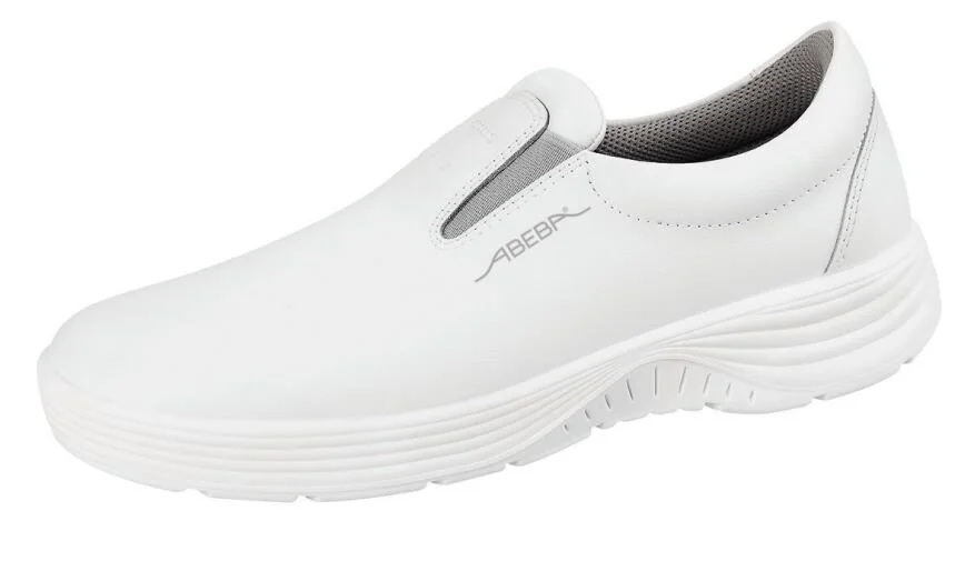 Atmungsaktiver Slipper in weiß der Serie ABEBA x-light. Rutschhemmende Berufsschuhe mit Gummizug im Ristbereich. Dämpfungsaktive, leichte PU-Laufsohle. Ein idealer Berufschuh für den sogenannten Weißbereich. Für den Einsatz in der Praxis, im Krankenhaus, der Gastronomie, der Küche und vielen weiteren Branchen.
