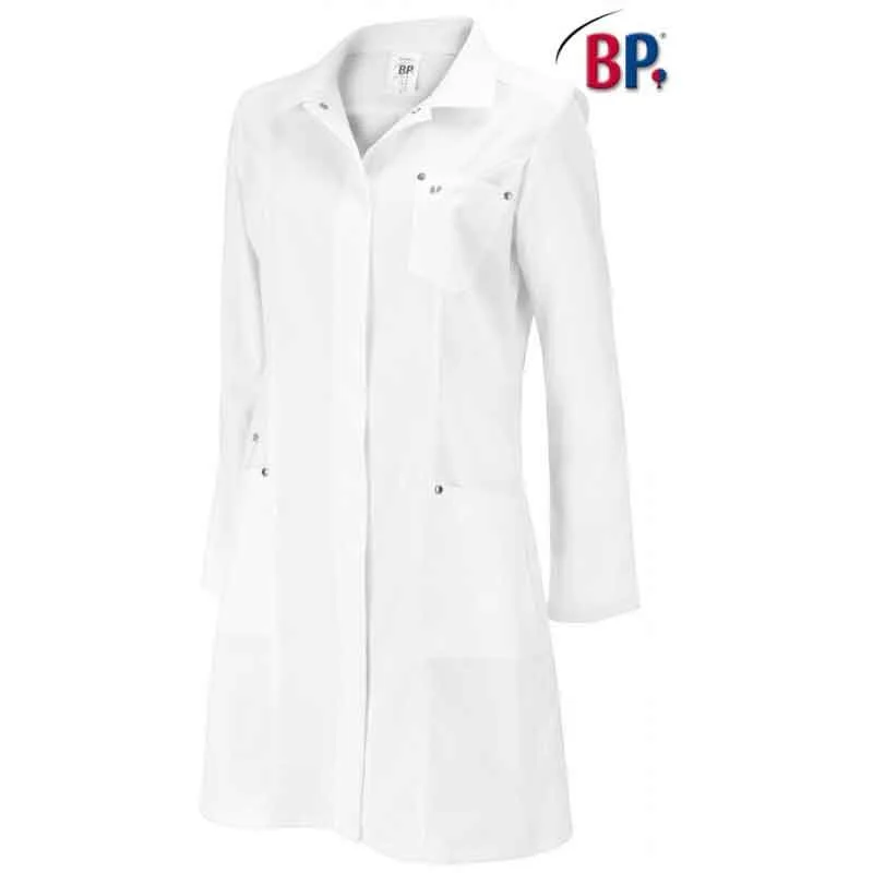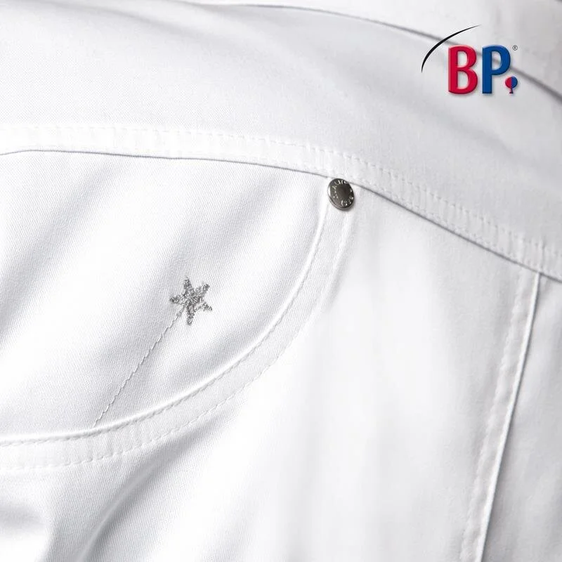 Dieser moderner BP Praxismantel Damenmantel 4874 684 21 für Damen mit verdeckter Druckknopfleiste und eleganten Nieten und Teilungsnähte. Er besteht aus Mischegwebe mit Strechanteil dadurch ist er Superelastisch und Dehnungsfähig.