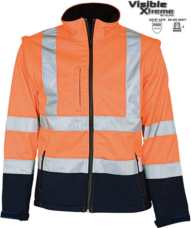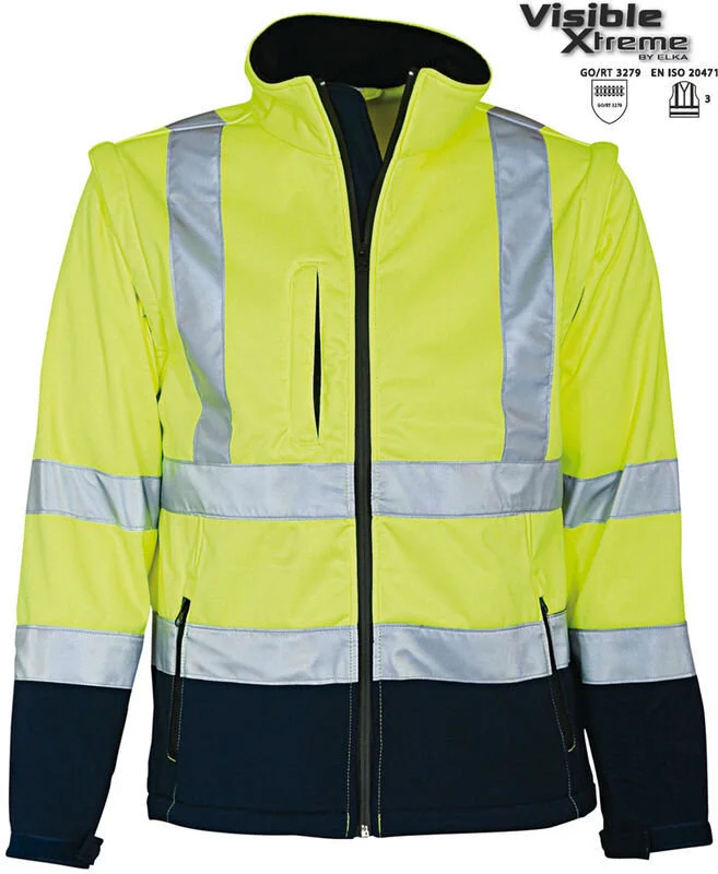 Winddichte und wasserabweisende Elka Softschell Jacke Warnschutzjacke mit abnehmbaren Ärmeln. Mit dieser Elka Softshell Jacke werden Sie immer und überall gut gesehen. Diese hochwertige, reflektierende Softshell Jacke kann bei Bedarf auch dank der abnehmbaren Ärmel als Weste getragen werden.