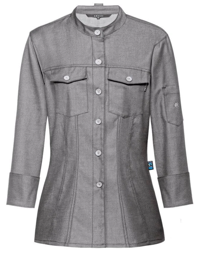 Die GREIFF Kochjacke für Damen im Jeansjacken-Style. Lässig und doch professionell. Eine Gastro-Jacke mit Metall-Druckknöpfen, Krempelarm, Logo und Kontrastnähten. Sie hat aufgesetzte Pattentaschen und eine Armtasche mit Platz für Ihre Kleinigkeiten und kleinen Utensilien, die Sie am Arbeitsplatz gerne griffbereit haben. Lüftungslöcher sorgen in dieser Textilie für ein Plus an Tragekomfort.