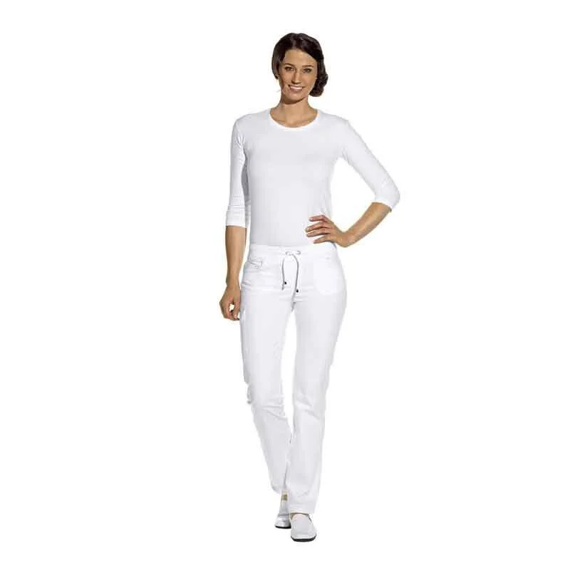 diese elegante Damenhose aus der Leiber Classic Style Serie für Medizin und Pflege ist aus pflegeleichtem Mischgewebe mit Strech gefertigt. Des Weiteren verfügt diese Damenhose in weiß von Leiber über zahlreiche Taschen. Für viel Bewegungsfreiheit sorgt bei dieser Leiber Damenhose 08/6980 das elastische Rippstrickbündchen mit Kordeltunnenzug.