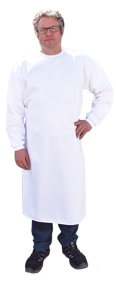 Einsetzbar ist der Kittel, der jeweils im Nacken und an der Taille auf dem Rücken mit Bindebändern zugebunden werden kann, auch in der Apotheke, im Labor, beim Zahntechniker, im Pflegeheim, beim Arzt oder Therapeuten in der Praxis. Er hat lange Ärmel, die mit Stretch-Strickbündchen dicht gehalten werden.