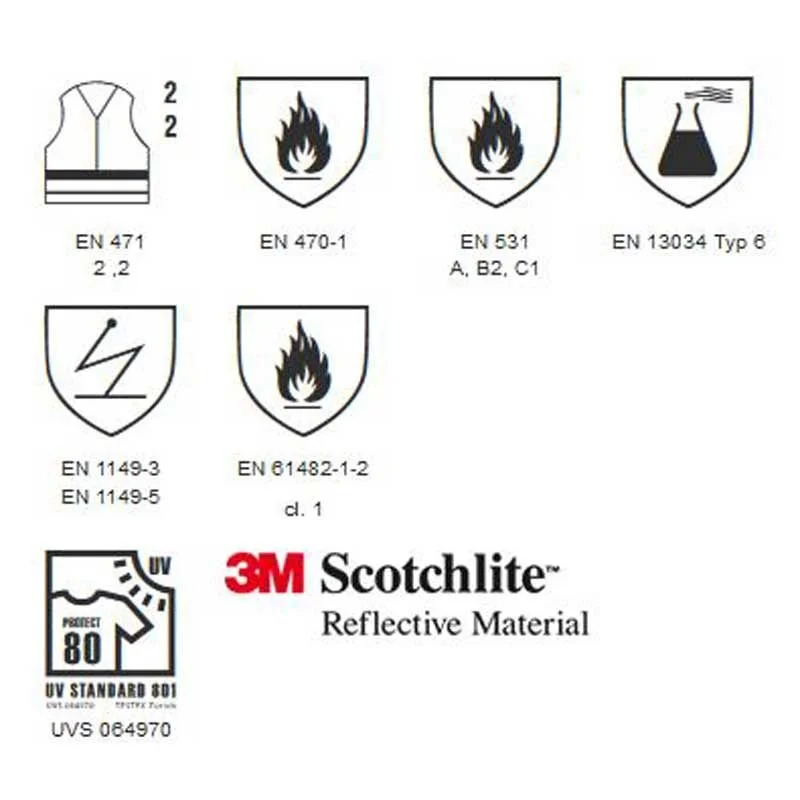 64 % Baumwolle, 35 % Polyester, 1 % antistatische Fasern, 2/2 Diagonal-Köper, Flächengewicht ca. 370 g/m², flammhemmend und Fluorcarbon ausgerüstet Reflexband 3M™TM Scotchlite™ Reflexgewebe 8935 silber (Farbweg gelb/kornblau)