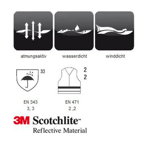 100% Polyester, PU beschichtet Futter: 100%Polyester Füllung: 100% Polyesterwatte Reflexband 3M Scotchlite 8910